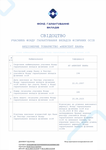 Свідоцтво про реєстрацію банку у Реєстрі Банків-учасників (тимчасових учасників) Фонду гарантування вкладів фізичних осіб №185. Дата реєстрації: 22 січня 2007 року. Реєстраційний номер 194, видане 20 серпня 2025 року.